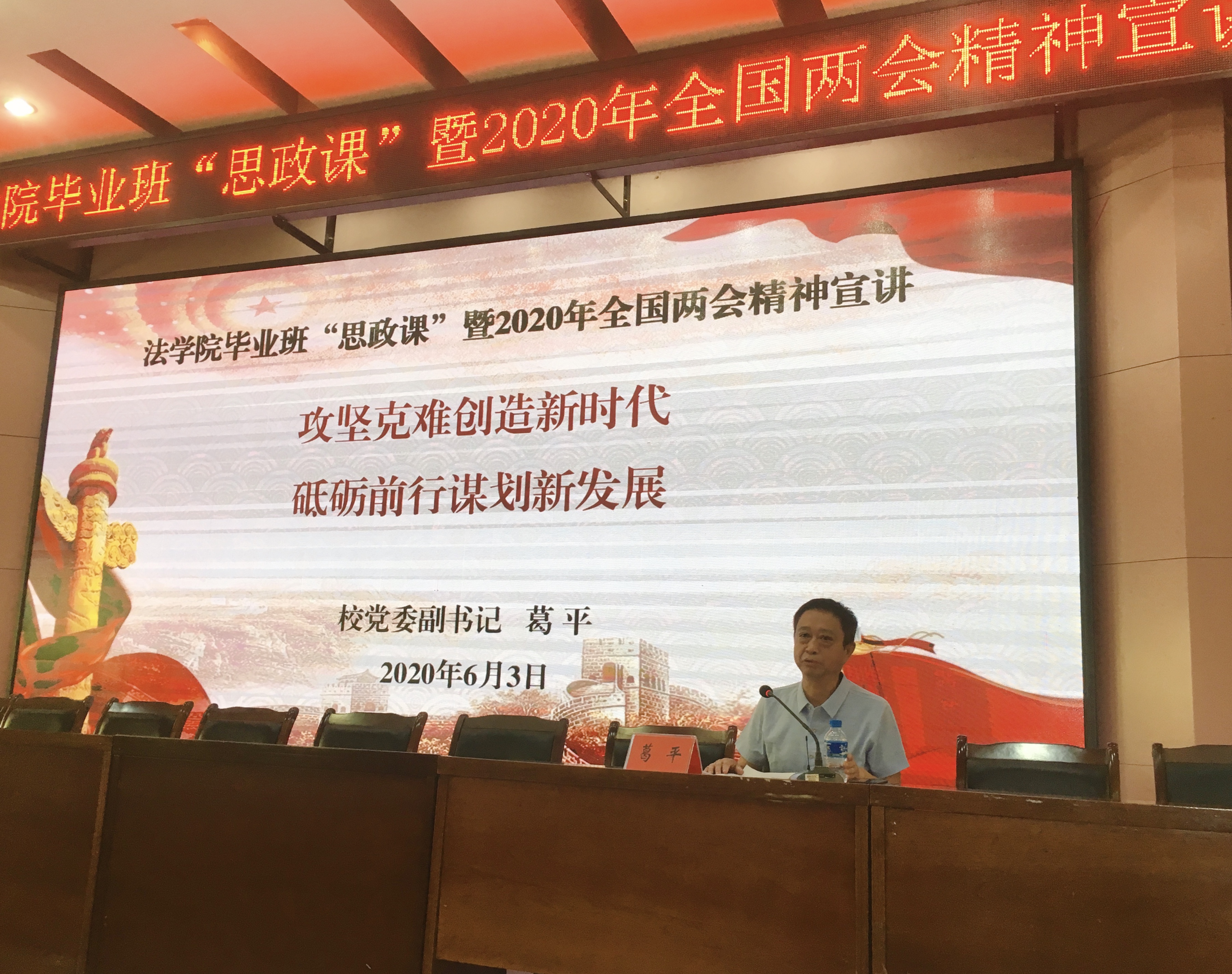 2020年6月3日下午2:30,葛平副书记出席法学院2016级毕业典礼,并做了全国两会精神宣讲,讲授题为《攻坚克难创造新时代 砥砺前行谋划新发展》思政课。
