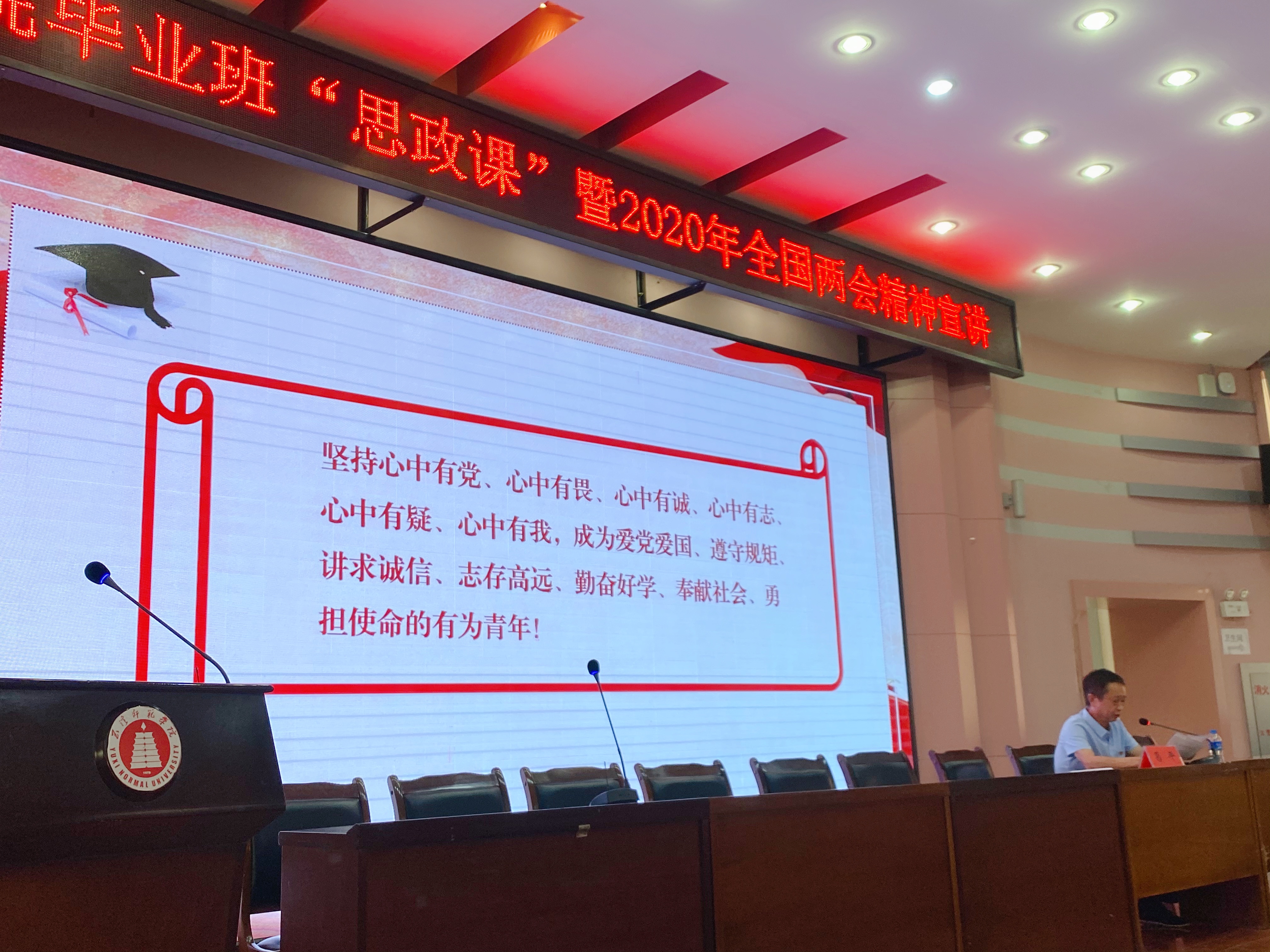 讲授最后,葛平副书记提出对全体毕业生与教师的期望—坚持心中有党、心中有畏、心中有诚、心中有志、心中有疑、心中有我,爱党爱国、遵守规矩、讲求诚信、志存高远、勤奋好学、奉献社会、勇担使命!