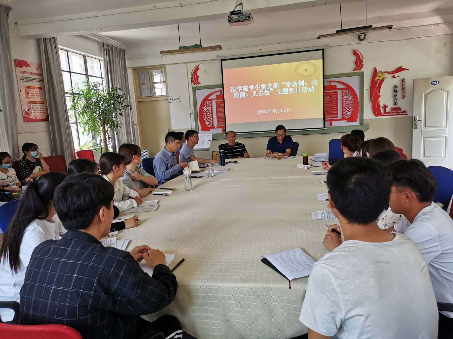 为推动中央条例的学习贯彻,引导广大党员自觉学条例、守条例、用条例,法学院学生党支部于2020年6月15日下午2:30在 四教202会议室举行6月份主题党日活动。本次活动邀请了法学院党委书记张国珺参加,会议由法学院学生党支部书记辛光武主持,法学院学生党支部支委及全体非毕业生党员参加此次活动。
