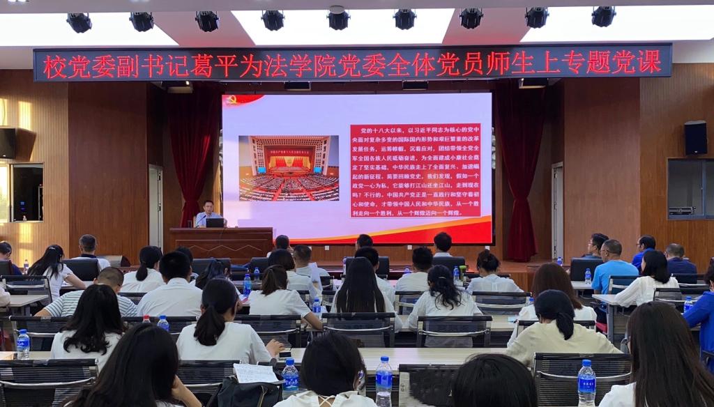 2020年6月29日,校党委副书记葛平为法学院党委全体党员讲授题为“坚定理想信念 践行初心使命 争做新时代合格党员”的党课。