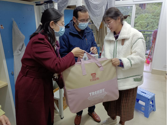 法学院党委书记张国珺、副院长朱艳英向2021级新生代表发放寒冬寒被、牛奶等慰问品,对两位新生表示关心和鼓励,嘱咐学生处理好自己的生活和学习。