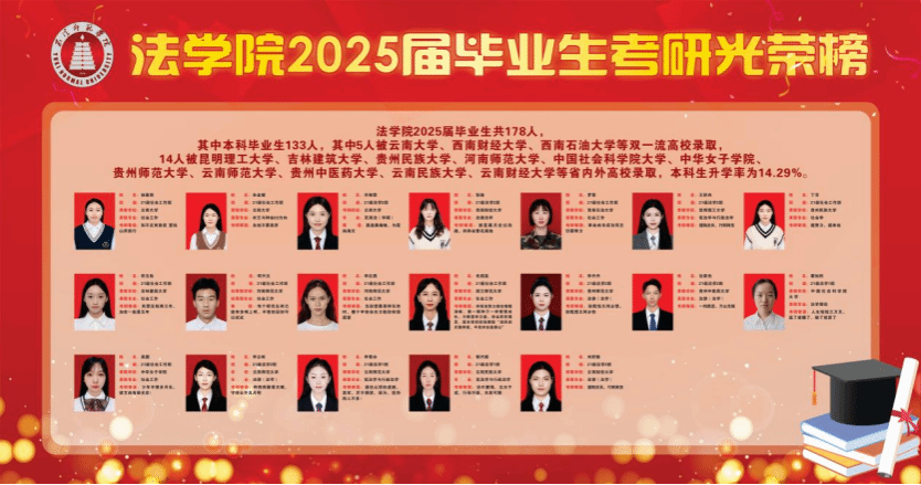 2025届毕业生共有 178 人,其中本科毕业生 133 人,有 19 位同学成功“上岸”,本科生升学率达到了 14.29%。这份沉甸甸的成绩单,不仅是青春奋斗的勋章,更是法学院优良学风传承的生动体现。在考研的漫漫征途上,法学院学子们凭借着自身扎实的实力,成功叩开了众多名校的大门。其中,许琳雯、杨春艳、朱金媛、张瑜、罗莹等5位同学被云南大学、西南财经大学、西南石油大学等“双一流”建设高校录取;翟旭彤等14 位同学被中国社会科学院大学、浙江师范大学、河南师范大学、中华女子学院、吉林建筑大学、昆明理工大学、云南师范大学、云南财经大学、云南民族大学、贵州民族大学、贵州师范大学、贵州中医药大学等省内外优质院校录取。