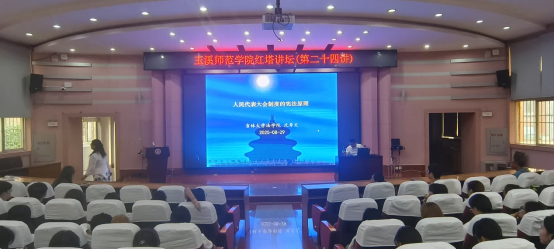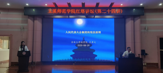 为深入学习贯彻习近平法治思想,深化对国家根本政治制度的理解认识,2025年8月29日,玉溪师范学院法学院在科学讲堂隆重举办"红塔讲坛"第二十四讲学术活动。本次讲座特邀吉林大学著名宪法学者沈寿文教授作题为《人民代表大会制度的宪法原理》的专题报告。法学院院长叶宏、党委副书记冶联凤、副院长朱艳英、法学系主任李颜超,法学院教师代表以及23级、24级法学专业全体学生共同聆听了这场学术盛宴。