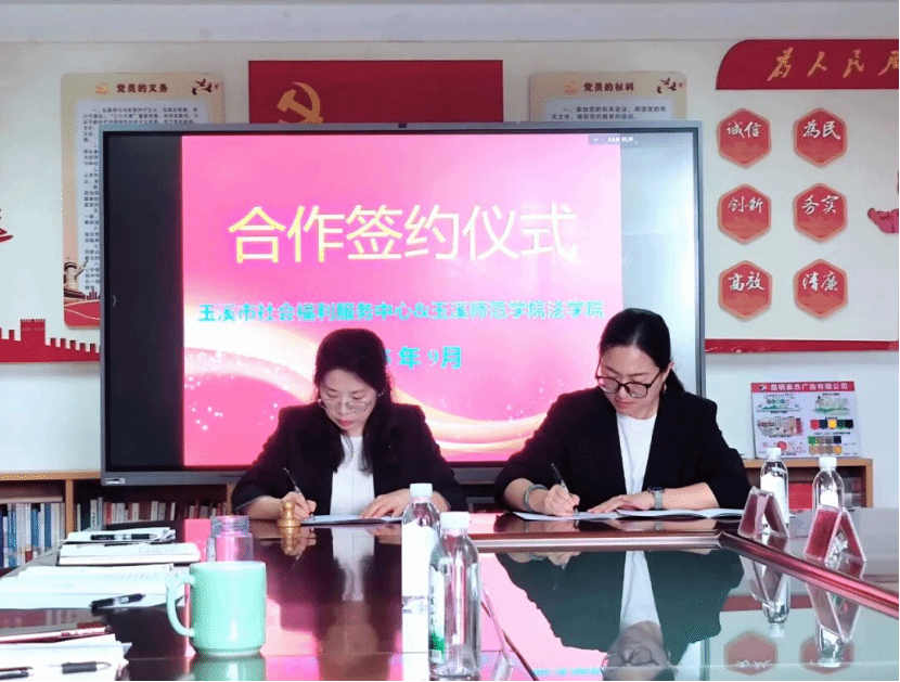 为助力玉溪市社会福利服务事业高质量发展,实现高等院校教育教学与社会福利服务实践密切交融,构筑新时代高素质专业人才培育高地与优质社会福利服务创新平台,玉溪师范学院法学院(以下简称法学院)与玉溪市社会福利服务中心(以下简称中心)秉持“合作共赢、资源共享、优势互补、携手共进” 的愿景与理念,于9月25日正式签订战略合作协议,并举行了玉溪师范学院协同教育实践基地授牌仪式暨实习工作座谈会。