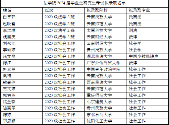 法学院2024年研究生考试再创佳绩!我院2024届毕业生139人,54人参加研究生考试,17名毕业生被录取。其中,法学专业4人,社会工作专业13人,分别被中国青年政治学院、重庆师范大学、西南民族大学、湖北民族大学、贵州民族大学、广东外语外贸大学、东北石油大学、北京建筑大学、云南师范大学、云南民族大学等省内外高校录取,升学率为12.23%。