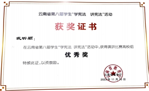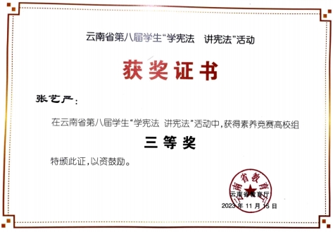 玉溪师范学院朱艳英老师指导的法学专业2021级学生张艺严获全省学生“学宪法 讲宪法”活动素养竞赛高校组“三等奖”,武正雄老师指导的法学专业2022级学生武昕颖获全省学生“学宪法 讲宪法”活动演讲比赛高校组“优秀奖”。