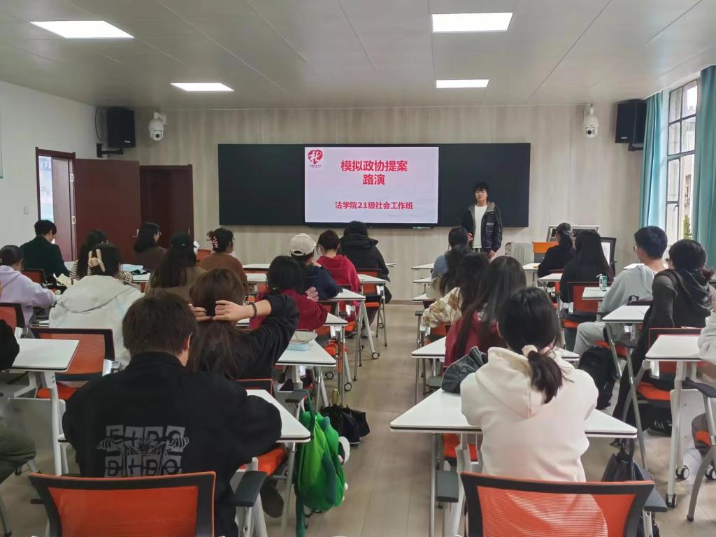 此次模拟政协路演活动,法学院团委结合学院法学和社会工作两个专业,通过引导在校大学生将自己所学知识与学校社区实地调研结合,发现学生社区中学生真实需要,以撰写模拟提案来参与一站式学生社区建设,为学生一站式社区建设建言献策。