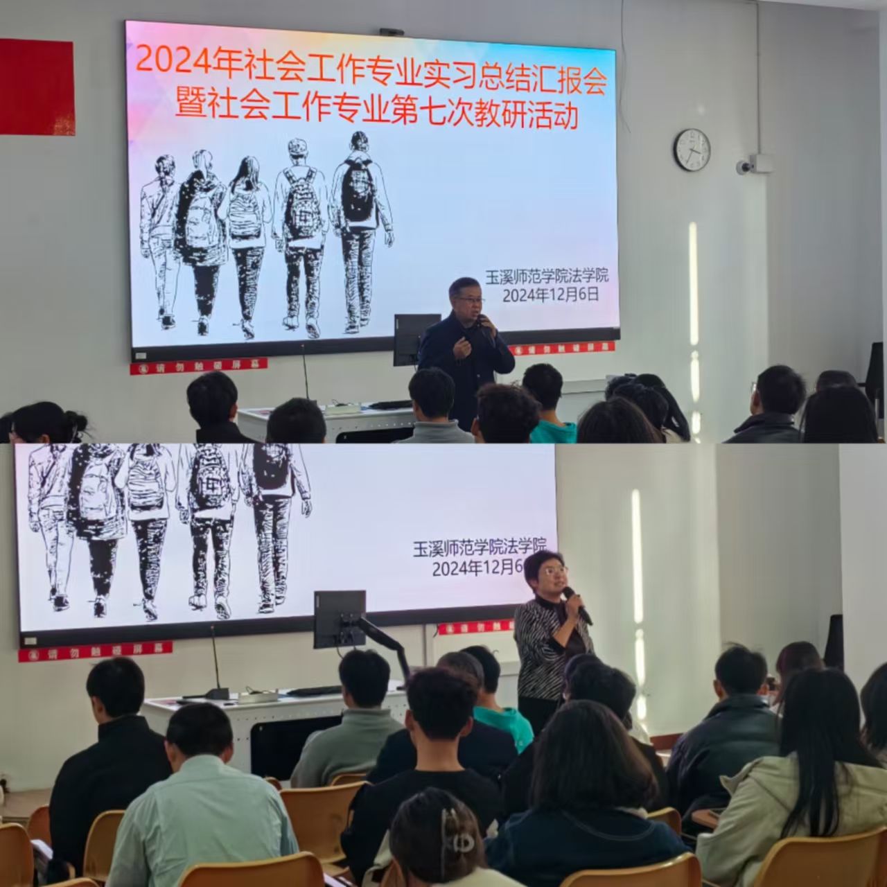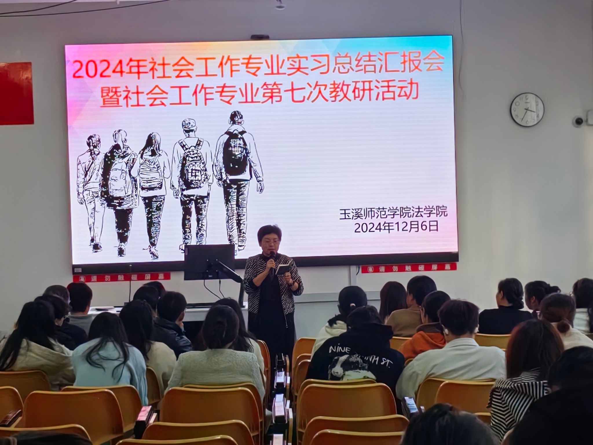 法学院党委书记彭松老师、党委副书记冶联凤老师、社会工作系主任杨娜老师、办公室主任昌晶老师、组织员王艳玲老师以及多位社会工作专业任课教师均出席了此次活动。同时,活动还盛情邀请到了红塔区青少年事务社会工作服务中心主任白雪老师、峨山县嶍峨为民社会工作服务中心司法社工何莉老师、红塔区党群服务中心的李晓娟老师和向悦老师。21级社会工作班、22级社会工作班、23级社会工作专升本班、24级社会工作专升本1班、2班的同学,总计160余人齐聚一堂,共同参与这场知识与经验交融的交流盛会。
