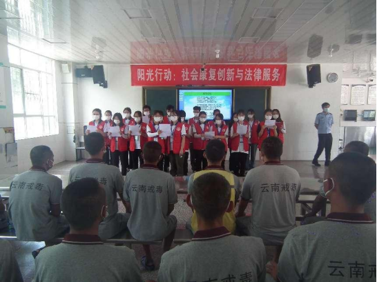 在6.26国际禁毒日来临之际,玉溪师范学院法学院35名大学生志愿者联合云南滇玉律师事务所的5名律师,在云南省第三强制隔离戒毒所开展了一场名为“阳光行动-社会康复创新与法律服务”的活动,志愿者们通过朗诵诗歌、普法小剧场、励志书法展示、互动游戏、现场法律咨询和发放法律宣传手册等活动,为戒毒学员们带来了丰富的文化享受和实用的法律知识,让他们在戒毒过程中拥有更多的力量与信心。