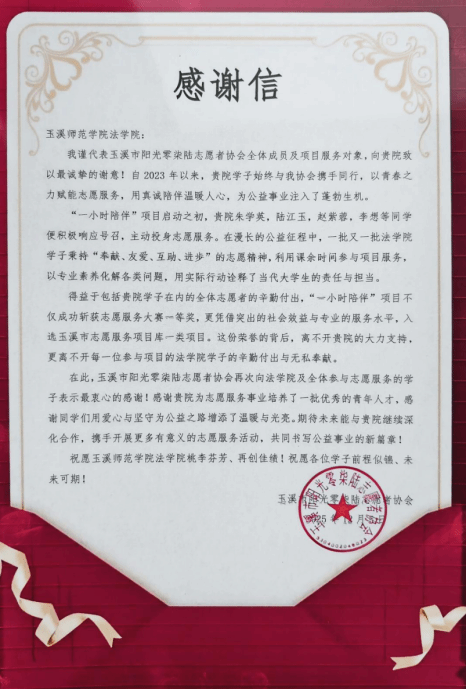 近日,法学院收到玉溪市阳光零柒陆志愿者协会发来的感谢信。信中对法学院学子自2023年起,积极投身“一小时陪伴”志愿服务的表现给予高度认可,称赞同学们在服务过程中展现出的扎实专业素养与强烈责任担当,这也是学院以实践服务为依托、推进人才培养工作的生动写照。